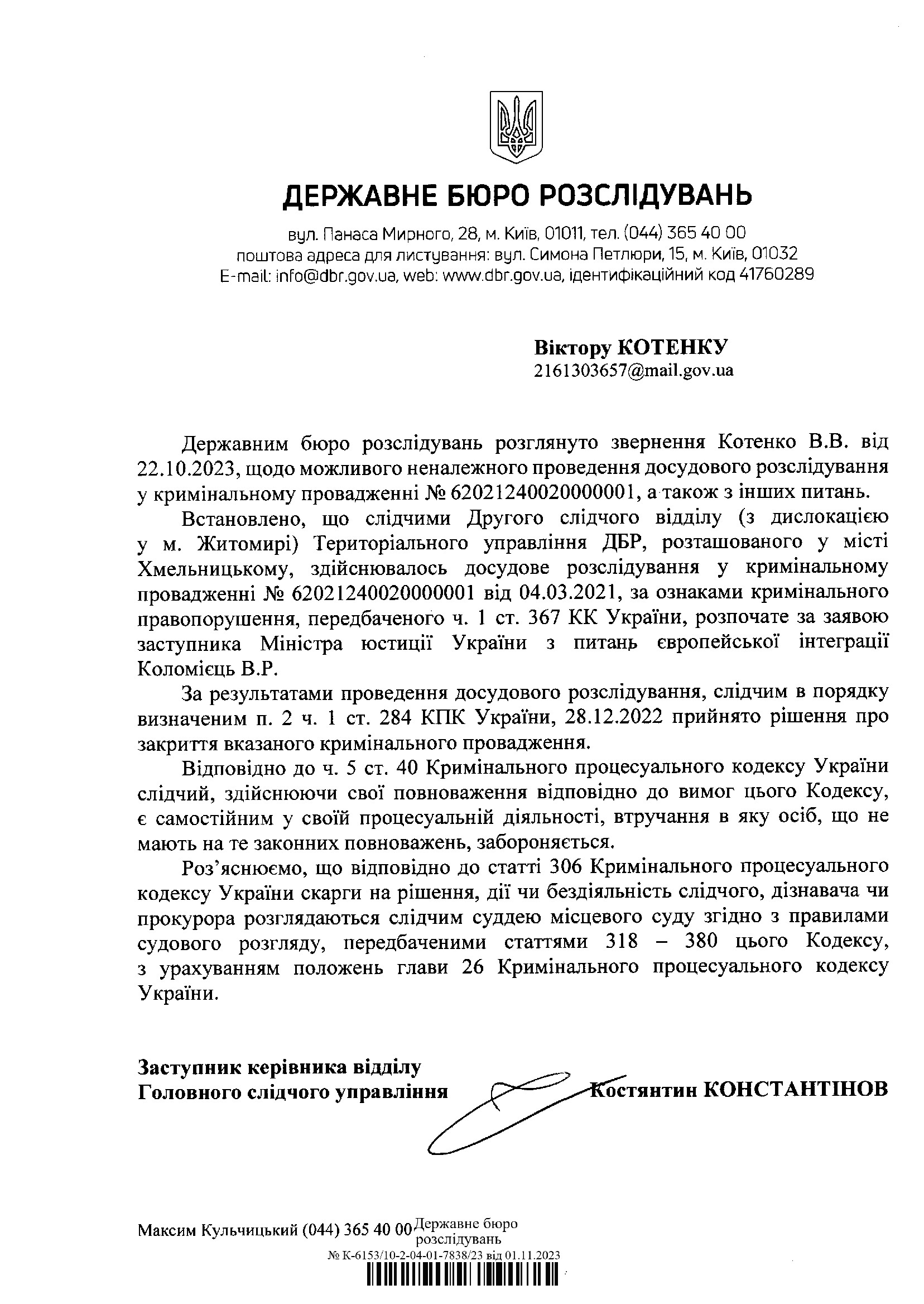 Так і не отримавши відповіді від ДБР, я задля спортивного інтересу кинув посилання на цей матеріал до НАБУ, яке оперативно відповіло у тому сенсі, що корупція у ДБР не їхня компетенція. Але НАБУшники переслали моє повідомлення до ДБР. Тут вже не можна було відмовчуватись, тому ДБРники просто нахабно збрехали і НАБУ, і мені. Щоб виправдати знищення кримінального провадження за моїм зверненням і заодно злочинну бездіяльність злочинного заступника злочинного міністра злочинного Міністерства, прости Господи, юстиції, Дебіли Бюро Розслідувань насмоктали фантастичну історію про те, що саме цю кримінальну справу порушували не за моєю заявою, а за зверненням заступника міністра з питань Євроінтеграції Коломієць. Дебіли Барани Розслідувань також накрили своїм «дахом» і шістку – слідчого. (але ж я недарма запитав у слідчого, за чиєю заявою справу порушено, «Звісно, за Вашою», — відповів Олег Щадило тощо )))