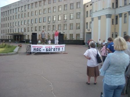 Из выступления дамы в шляпке: «Оранжевая власть плохая, а вот мэр города Житомира Вера Шелудченко – хорошая! По сравнению с другими городами, у вас на улицах чисто и дороги ремонтируют!» В общем – коммунальный маразм, аншлага не получилось. Как тут не вспомнить «детей лейтенанта Шмидта» из знаменитого произведения Ильфа и Петрова «Золотой телёнок», мошенников, поделивших страну на участки для жульнического промысла!