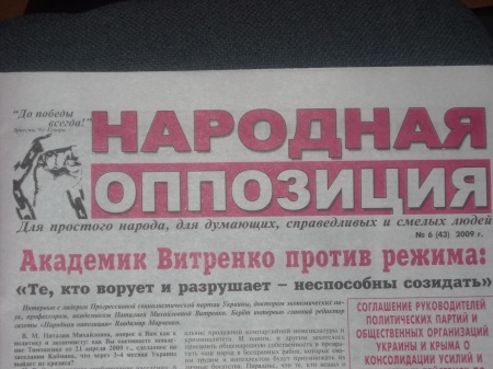Почему – то тихонько, почти что из – под полы, раздавали газету пророссийских прогрессивных социалистов «Народная оппозиция». Оказывается, для достижения всенародного счастья не хватает всего лишь пары пустяков. На первой полосе – новейшая концепция социализма «а – ля Витренко», цитирую дословно: