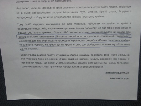 Ни для кого не секрет, что правящая в Украине мафиозно – клановая власть интересы своего народа не только не отстаивает, но и предаёт их на каждом шагу. Ещё немного – и Украина как демократическое государство просто перестанет существовать. И никто, кроме нас самих, не в силах остановить сползание страны в пропасть (авт.) Методы реализации, правда, лидером НАС декларировались пустышные. «Мы должны показать власти ..., заявить о себе ..., конференции ..., встречи..., круглые столы..., сбор инициатив», и ... всё. К тому же, лидер, вещая на всю Украину, допустил непростительные грубейшие промахи и ошибки. Например, несколько раз в прямом эфире утверждал, что в результате экспорта(!!!) в страну валом прёт товар, а импорт(!!!) товаров из Украины , мол, загнивает. Со слов Пабата, с этой новостью он объехал уже более 90 городов Украины! Декларируя экономические реформы, до сих пор настойчиво, словно «двоешник», путает импорт с экспортом! А заученная фраза, повторенная в эфире неоднократно, о страшном дефиците «м’яса яловичини, свинини і птиці»? («Кролики — это не только ценный мех ...»?) А слова о том, что для пользы дела подписал бы соглашение даже с чёртом? (на заданный вопрос о связях с Леонидом Черновецким — авт.) Как вам интеллектуальный и моральный уровни верхушки политдвижения — айсберга! Да-а, велика Украина — но, извините, не все же в ней идиоты!
