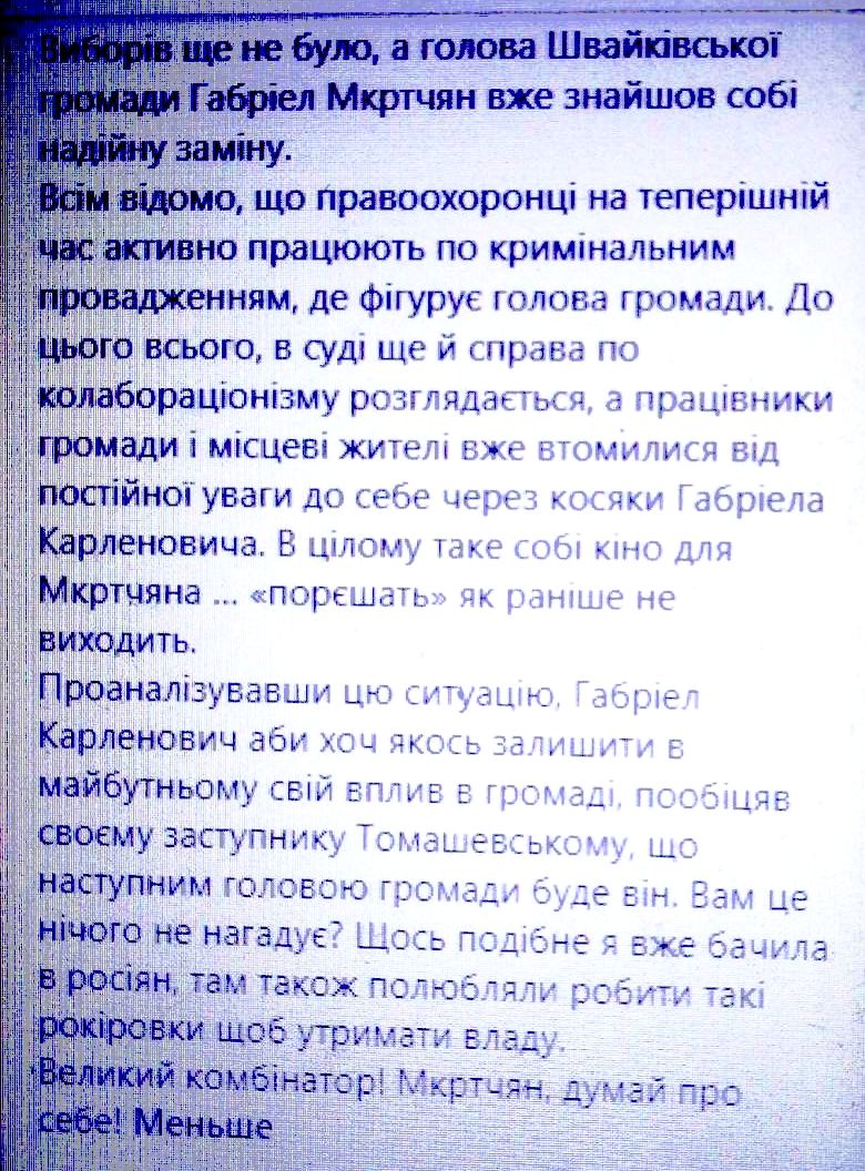До мене звернулись обурені місцеві активісти Швайківської ОТГ Бердичівського району Житомирської області. Обурені тим, що на протязі тривалого часу правоохоронні органи, суди та прокуратура не спроможні притягти до відповдальності, як вони стверджують, колаборанта, шахрая і хабарника Габріела Мкртчяна — сільського голову Швайківської об’єднаної територіальної громади.