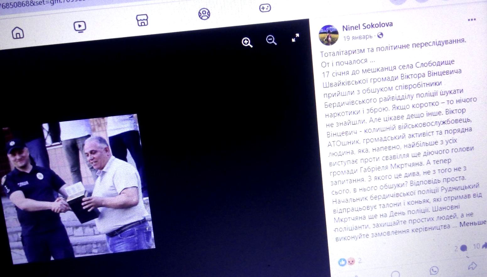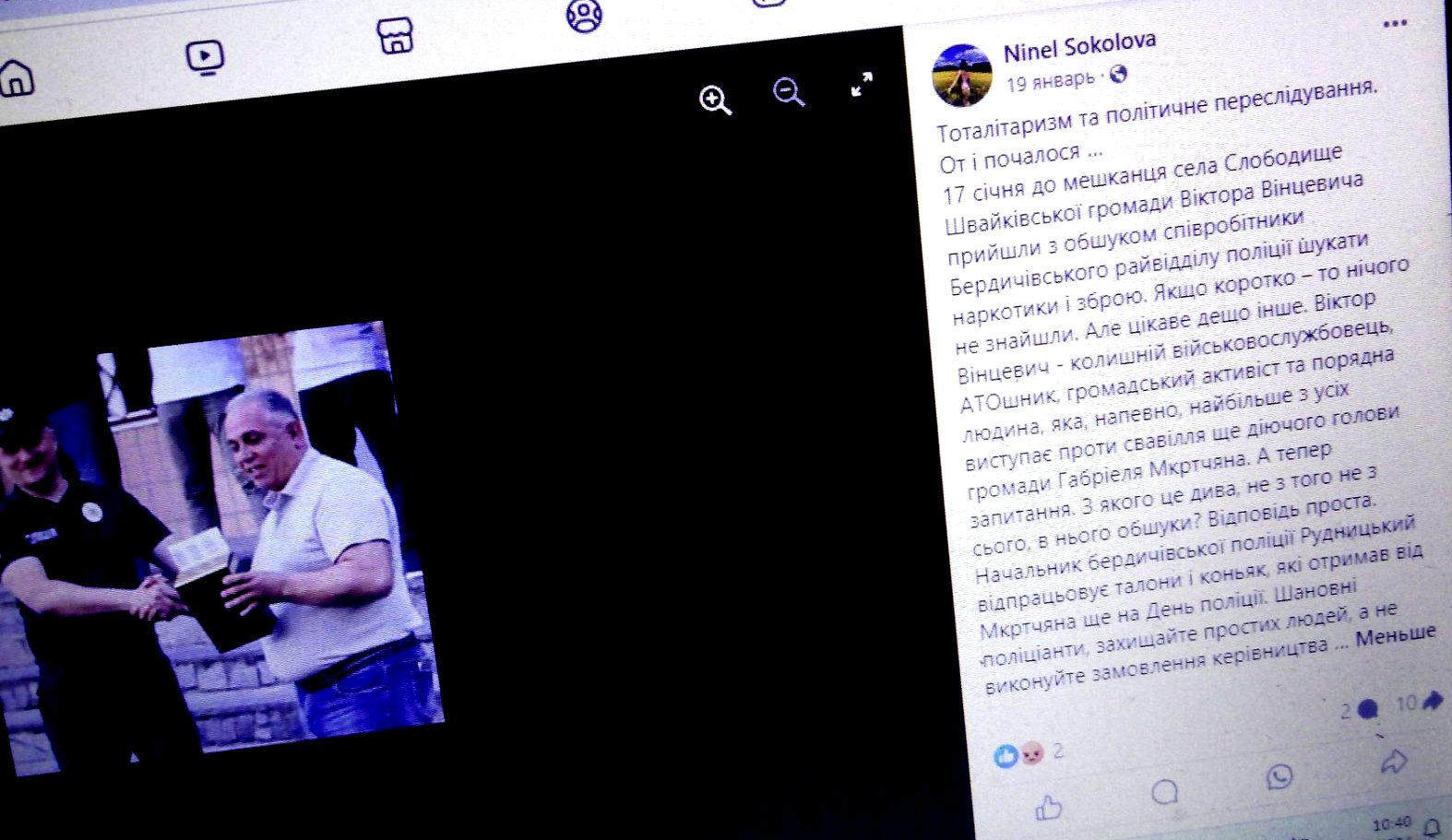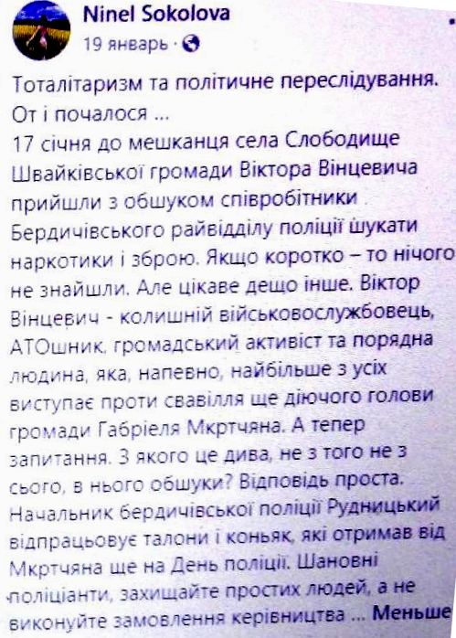 Нінель Соколова повідомляє у ФБ: начальник поліції отримав від Мкртчяна талони (?) і коньяк; поліція вдерлась з обшуком до патріота (клацніть на фото) :