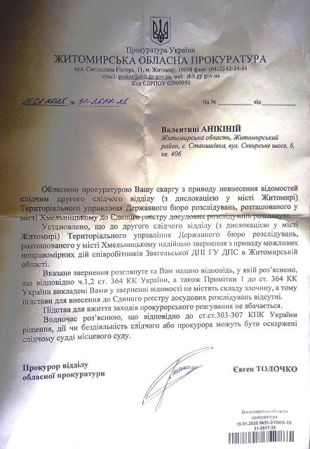 Прокурор Житомирської обласної прокуратури Євген Толочко чомусь у злочині злочину не вбачив. А знаєте чому ? Тому що цей злочин організували керівні покидьки з правоохоронної системи, а точніше з СБУ, його сусіди по свинячому кориту, функціонери злочинної спільноти «Житомирське кубло», які, швидко оговтавшись після Майдану, буквально захопили всі державні структури Житомирської області. Велике очищення, сподіваємось, відбудеться після закінчення війни, а поки що ми змушені лише споглядати за неподобствами і документувати їх.