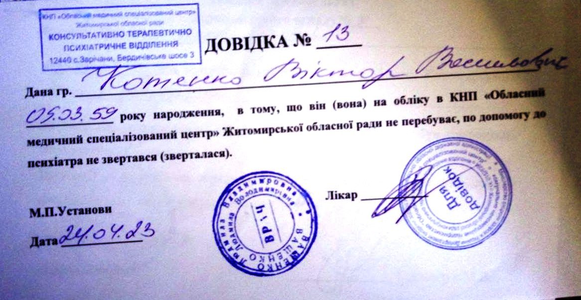 Во время рассмотрения дела в кругу членов КДКА в своё оправдание этот так называемый адвокат, а фактически юридический дебил, письменно и публично объявил гражданина Котенко дипломированным сумасшедшим, придумав, что он якобы больше 40 лет состоит на психиатрическом учёте с тяжелейшим диагнозом, в очередной раз продублировав давнишние безуспешные стандартные попытки своих кгб/сбу-ченых друзей загнать «антисоветчика» в «психушку». За что и получил уголовное производство и судебный иск в Житомирский районный суд о защите чести и деловой репутации. Уголовное производство мусора раз десять закрывали, а суд сверхдлительное время всё никак не может рассмотреть дело (сменилось три судьи !!!, самоотводы и отводы, предварительное первое заседание перенесено и назначено на 20.05.2025 г.)