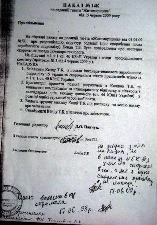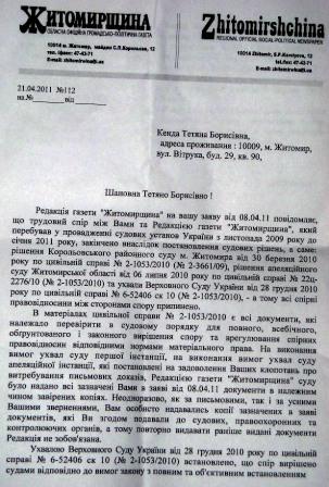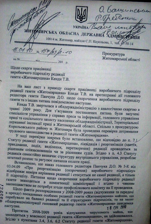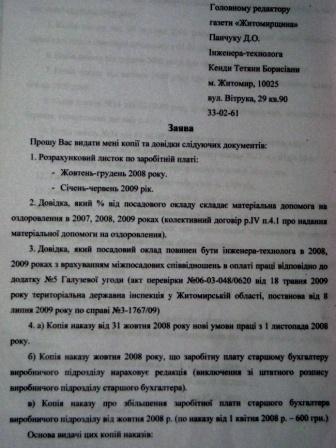 Буквально на днях совершенно случайно мне довелось побеседовать с бывшей сотрудницей  редакции газеты «Житомирщина» Кендой Татьяной Борисовной, которая оспаривает в судах своё незаконное увольнение. Уж очень она просила предать гласности выложенную информацию. Наша беседа документировалась видеокамерой.