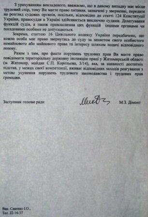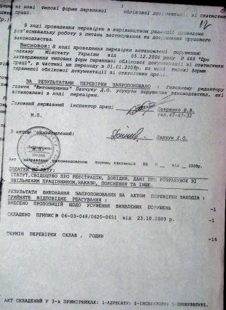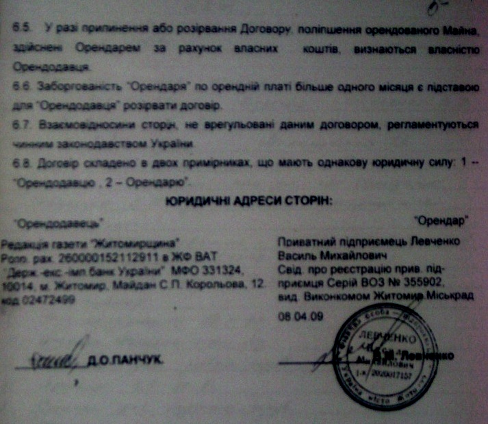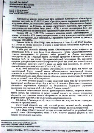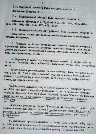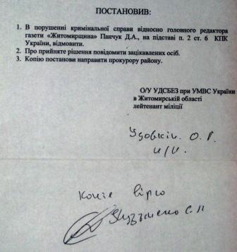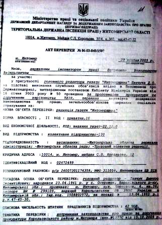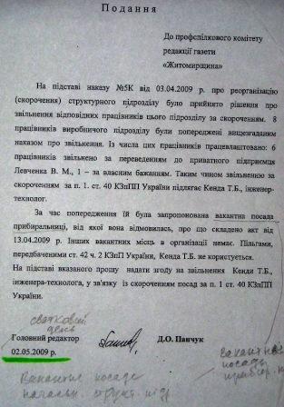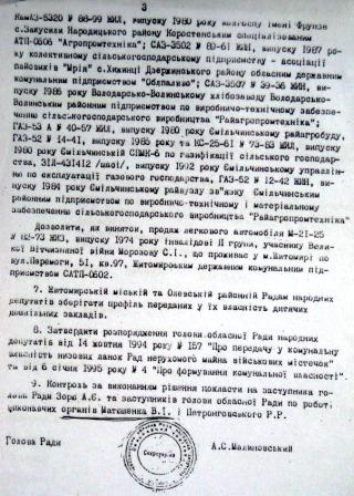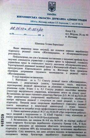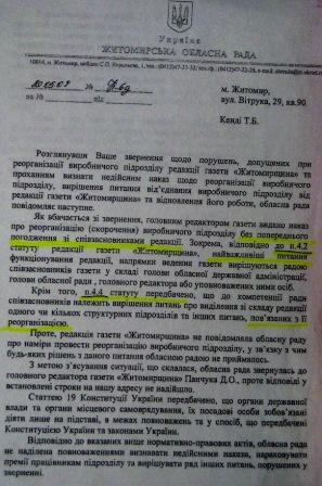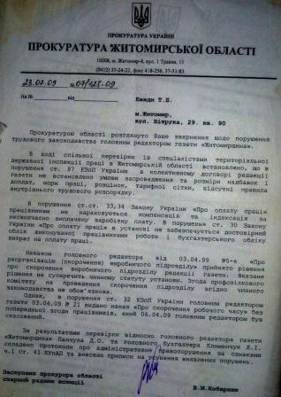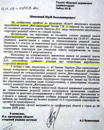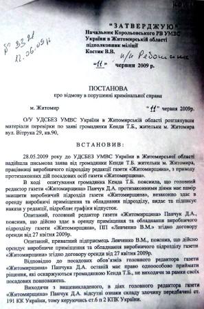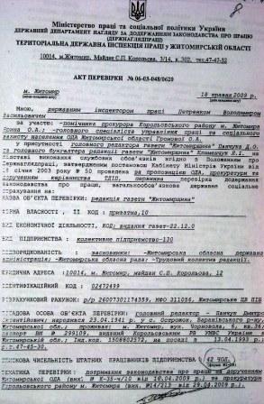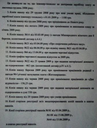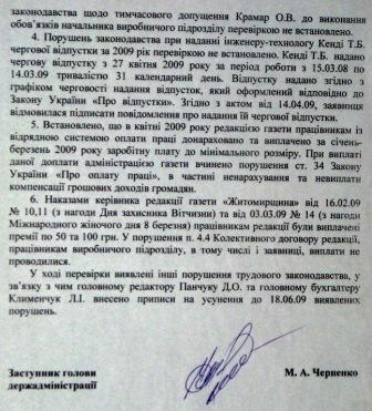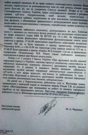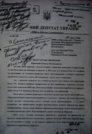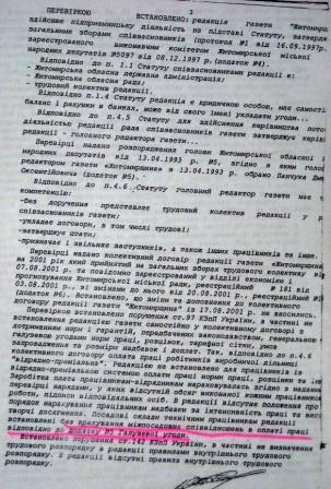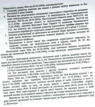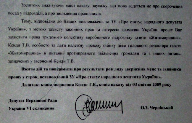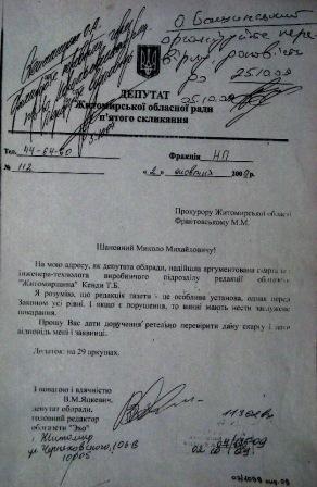 Прилагаются фотокопии некоторых документов, свидетельствующих о вопиющих безобразиях в деятельности социалистического наследия — редакции газеты «Житомирщина» и государственных чиновников. Вы увидите всё те же знакомые фамилии членов этого творческого коллектива: Черпицкий, Яцкевич, Костик, Димонт, Малиновский, Панчук, Черненко, Чумаченко, Кобернюк, Гансецкая, Охрименко, ...  Бригада.