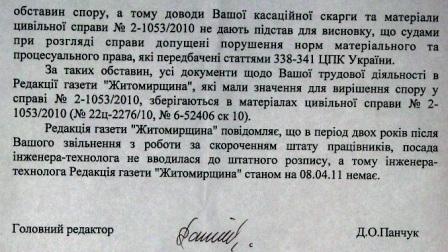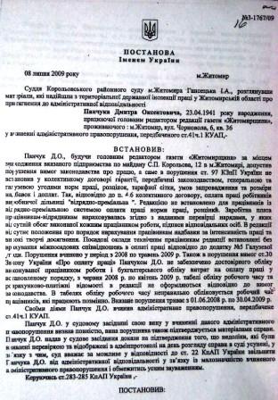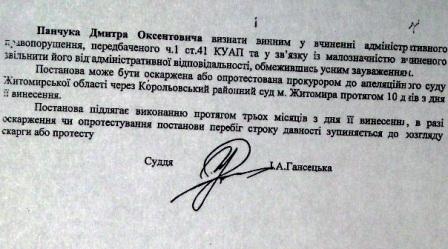 Несмотря на тесную дружбу главного редактора с власть имущими, грубейшие нарушения законодательства в деятельности «Житомирщины» были задокументированы официальными проверками и даже решением суда Королёвского района, которым судья Гансецкая сказала новое слово в мировой практике правосудия, строго наказав главного редактора Панчука за вопиющие нарушения закона, приговорив его ... к  устному замечанию!