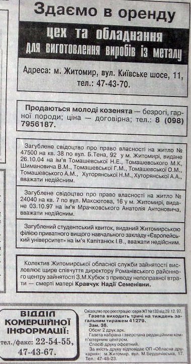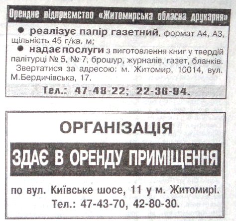 В этом номере размещены объявления о сдаче в аренду "Житомирщиной" госимущества - площадей бывшего КТБ Облбытуправления