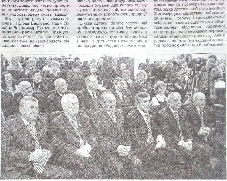 Фото: 2009 год. Помпезное чествование прошлой властью раковой опухоли — 90 лет со дня основания газеты «Радянська Житомирщина». Традиции придерживается и новая ( бывшая позавчерашняя) власть — 6 мая 2011 года губернатор Житомирщины Сергей Рыжук обласкал наградами своего друга, главного редактора «Житомирщины» в связи с Днём Победы. Опять память погибших осквернили ...