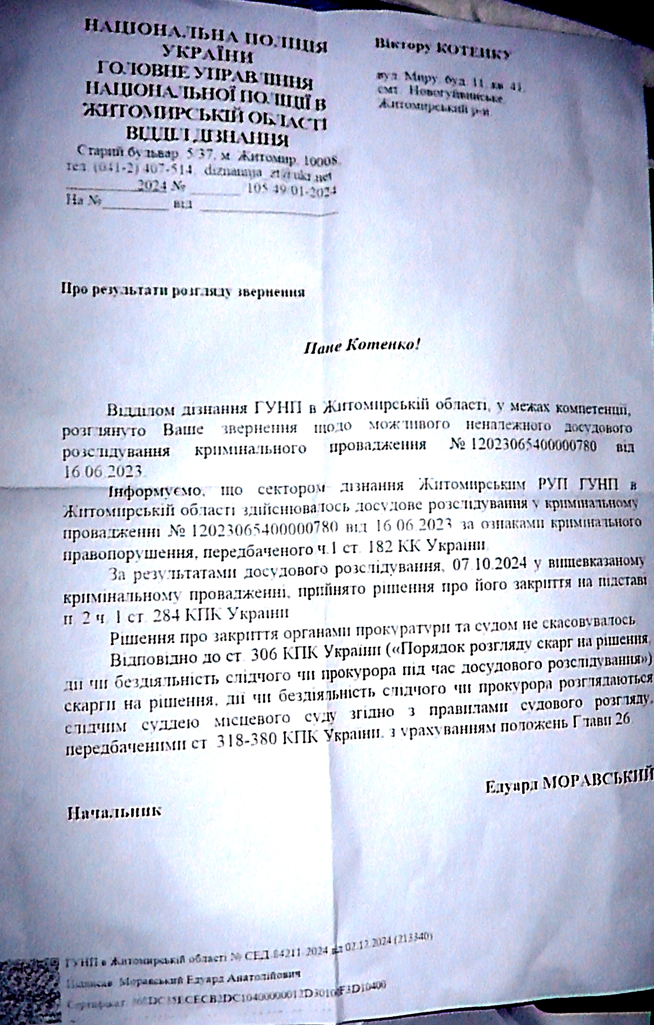 І ось тепер цей хитрожопий Едик вирішив змухлювати, з чим його і вітаю. На мій черговий запит до слідчого управління ГУНП про долю кримінального провадження (на попередні просто не відповідали) я 31 грудня 2024 р. вийняв із поштової скриньки типовий зразок нахабного поліційного шахрайства. Чудово знаючи, що постанова про закриття кримінального провадження була скасована прокурором Толочком 04 грудня 2024 р., цей маніпулятор датував свою відписку 02 грудня 2024 р., нібито йому на той момент ще не було відомо про скасування прокурором постанови дізнавача Семченкова. Та і на поштовому штемпелі стоїть красномовна дата 20 грудня 2024 р. Зміст відписки вельми цікавий, читайте: